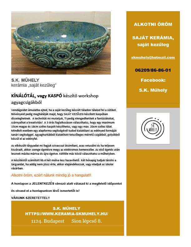 Vendégeidet ámulatba ejted, ha a saját kezűleg készült táladon tálalod fel a sütiket. Növényeid pedig meghálálják majd, hogy SAJÁT KEZŰLEG készített kaspóban díszeleghetnek. A technikát mi mutatjuk, Ti pedig elengedhetitek a fantáziátokat, szárnyalhat a kreativitás! A 2 órás foglalkozáson választhatsz, hogy egy maximum 15cm magas és 18cm széles kaspót készíthetsz, vagy egy max. 20cm széles tálat. Mindkét esetben egy alapforma segítségévél tudod kialakítani az edényed formáját tanári segítséggel. Agyaghurkákból kialakított tetszőleges méretű csigákból, golyókból készül el az edényfal.